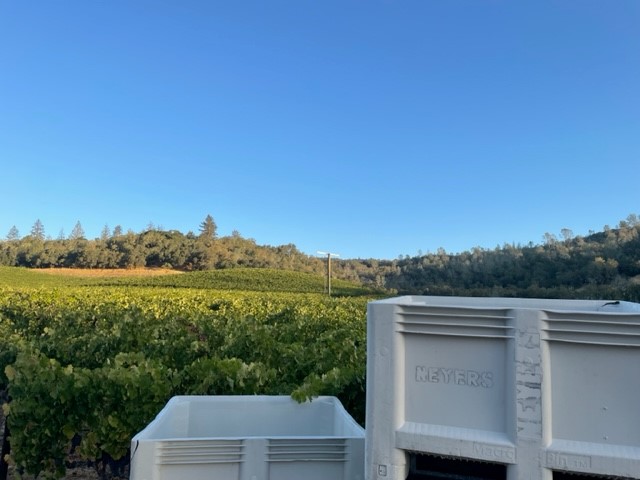The 2023 harvest is almost in the books now, as we are scheduled to pick our last remaining vineyard on Wednesday — the Cabernet Sauvignon on Toni’s block of our Conn Valley ranch. I love this photo that Lizzie took this weekend, standing in Toni’s block, and looking north with the ÂME vineyard in the background. We pick entirely by hand, and the grapes are placed in these one-half-ton white picking bins for transport to the winery. The structure in the center of the photo is a wind machine that we use to protect vines from frost in the spring. We also used it twice this fall after a light rainfall, in order to dry off the leaves and clusters.